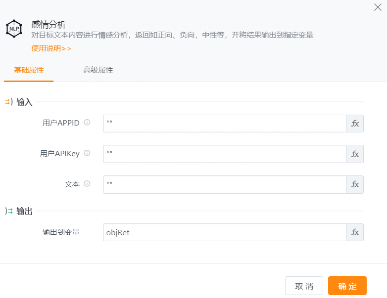 对目标文本进行感情分析,并将结果输出到指定变量。