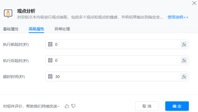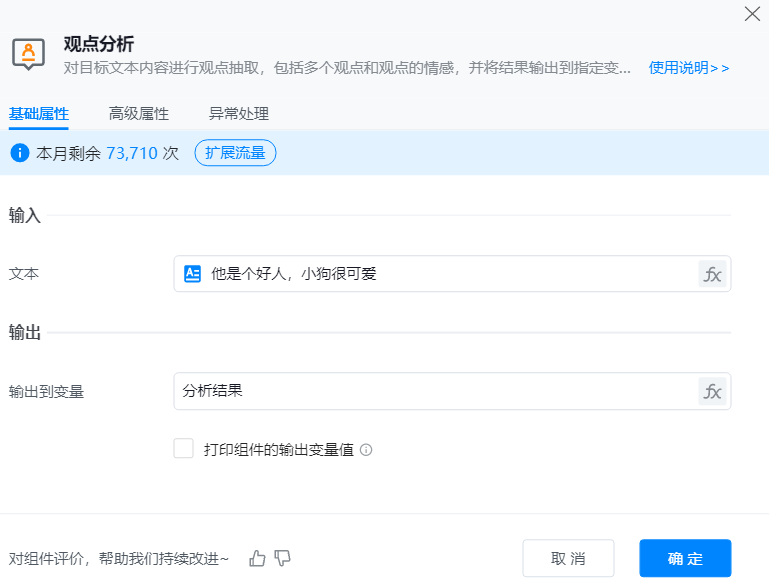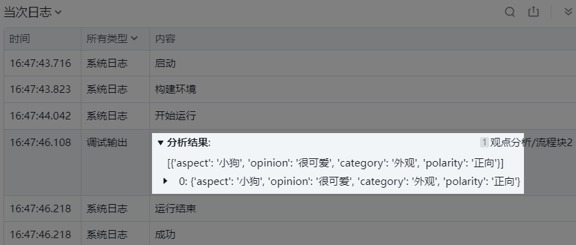 对目标文本内容进行观点抽取,抽取文本的多个观点以及观点的情感,并将结果输出到指定变量。