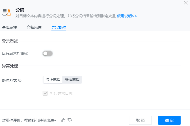 ● 异常重试:当流程运行过程中发生异常时,可根据实际需求配置是否启用重试逻辑。