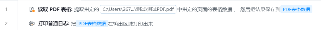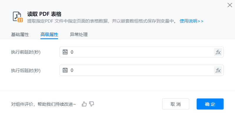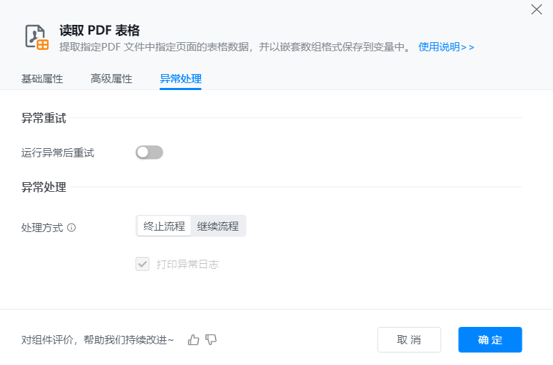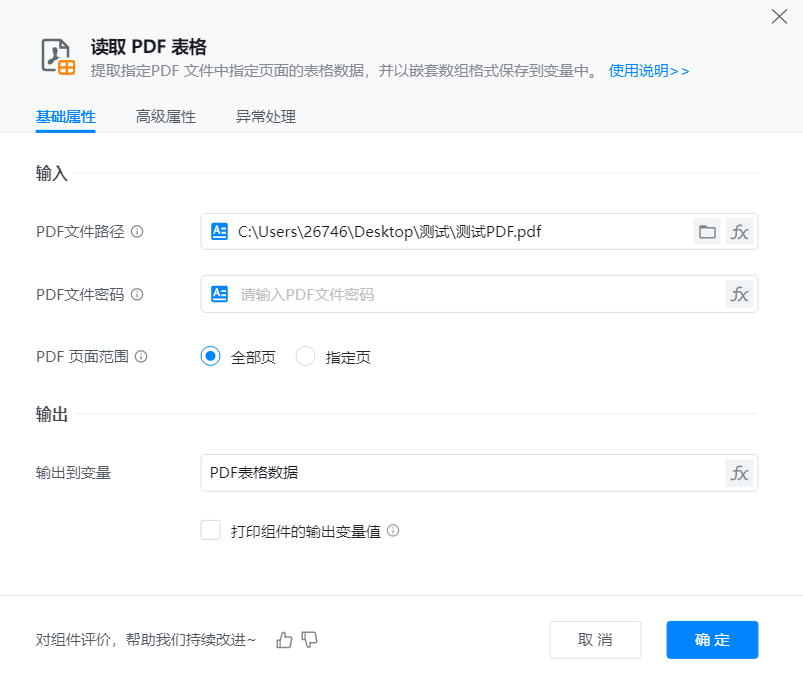 添加【读取PDF表格】组件到可视化编辑区,并配置其基础属性。