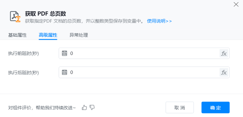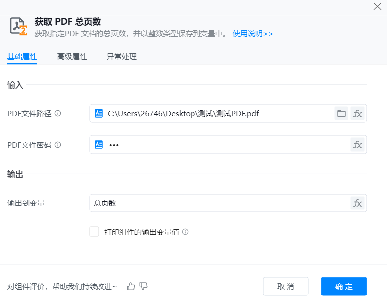 添加【获取PDF总页数】组件到可视化编辑区,并配置其基础属性。