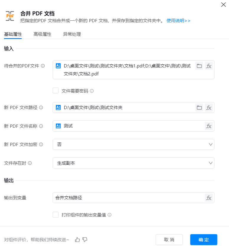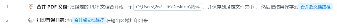 ● 输出到变量:将合并后的文件路径,赋值到路径变量。用于在流程中定义和存储数据,以便在后续步骤中动态获取和使用这些信息。