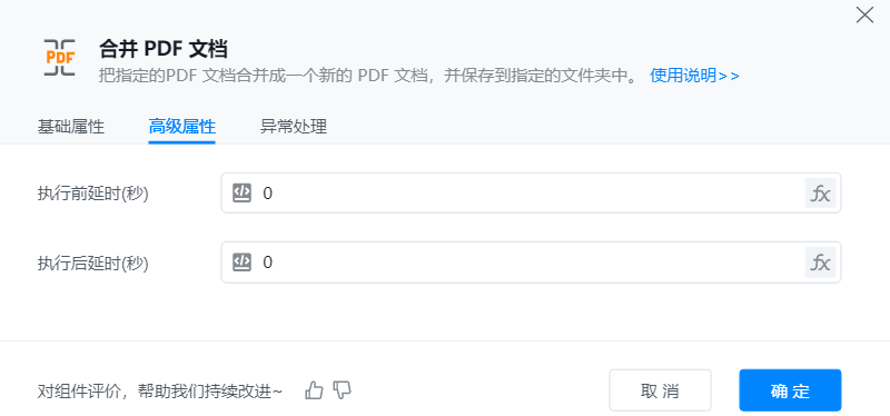 ● 待合并的PDF文件:可以点击右侧“小文件夹按钮”手动选择文件夹或者点击”fx“选择已保存的文件夹变量。若输入多个则用“;”分隔或点击“小文件夹按钮”选择多个。