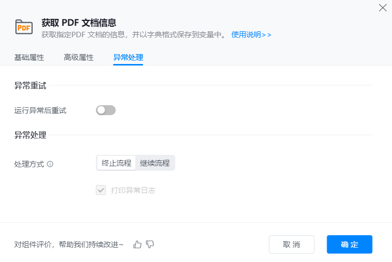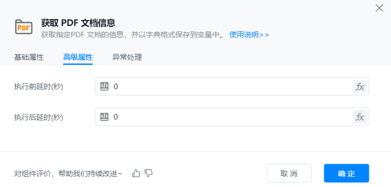 添加【获取PDF文档信息】组件到可视化编辑区,并配置其基础属性。