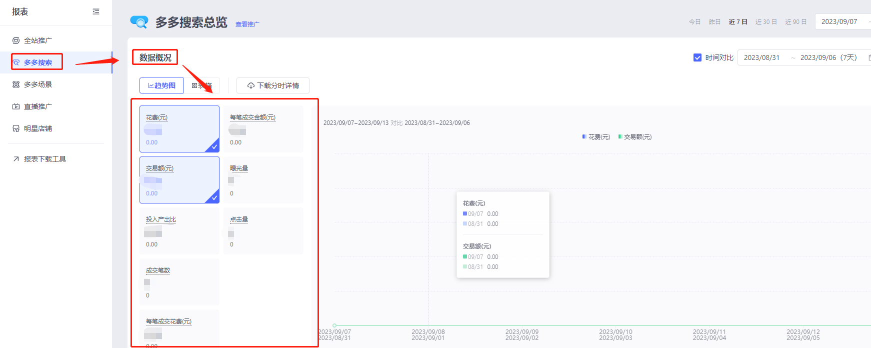用于采集 拼多多-推广平台-报表-多多搜索-数据概况 下的界面数据。