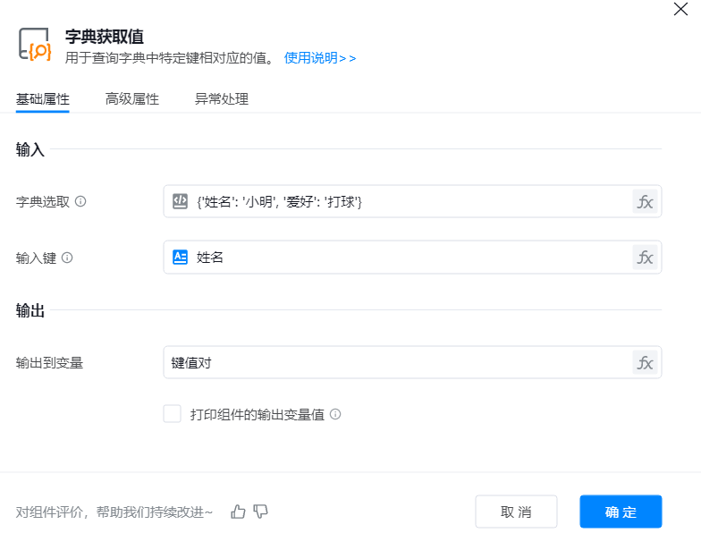 添加组件,在属性框中选取目标字典和键名,如获取“姓名”这个键的值。运行组件,将其对应的键值结果输出并保存到变量。