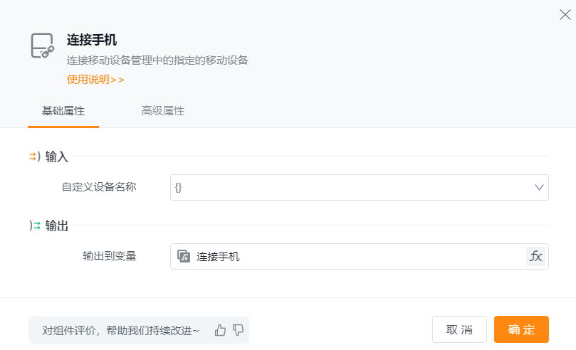 ● 输出到变量:将手机连接保存至指定变量,后续流程可直接调用该变量来直接调用该连接。