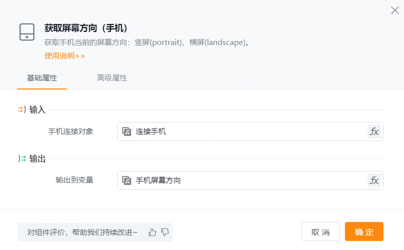 ● 输出到变量:将手机屏幕方向的值赋给某个变量。默认变量名称为screenOrientation,用户可自行修改变量名、点击fx选择已有的变量。