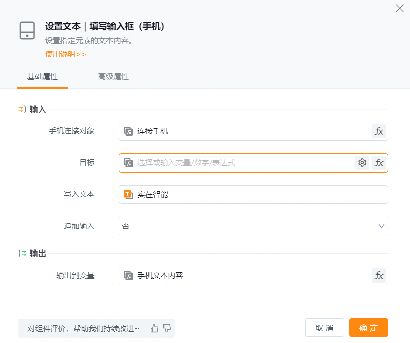 ● 追加输入:是否在输入框中已有的文本后添加指定的文本内容。默认选“是”。选“是”则在输入框已有的文本后添加“写入文本”中指定的内容;选“否”则清空输入框中已有的内容,替换为“写入文本”中指定的内容。