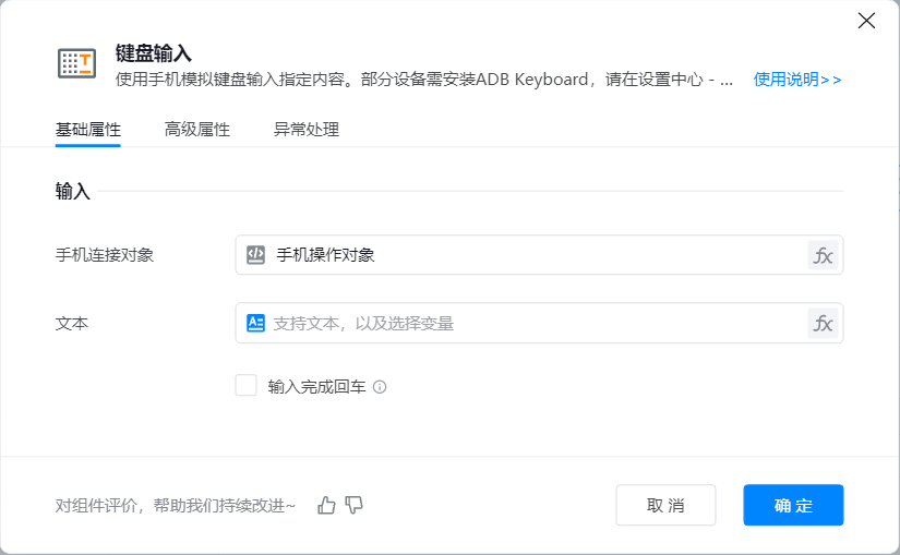 部分手机如无法运行组件,请安装ADB键盘插件: