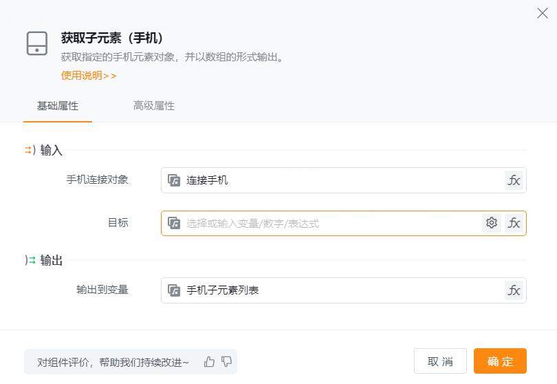 ● 目标:用户可从元素库中选择一个已捕获的元素作为操作目标;也可指定之前通过“元素拾取(手机)”获取的元素的变量作为目标。