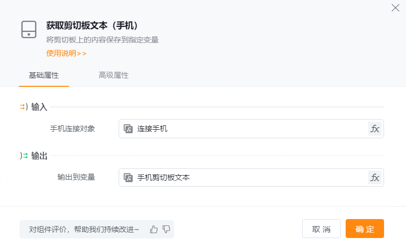 运行该组件时,系统将读取手机剪切板的文本内容,并将文本内容存入指定变量。若想要实现“文本粘贴”的效果,可以将该组件与“填写输入框”的组件进行结合,将剪切版的内容,作为输入框输入的内容。