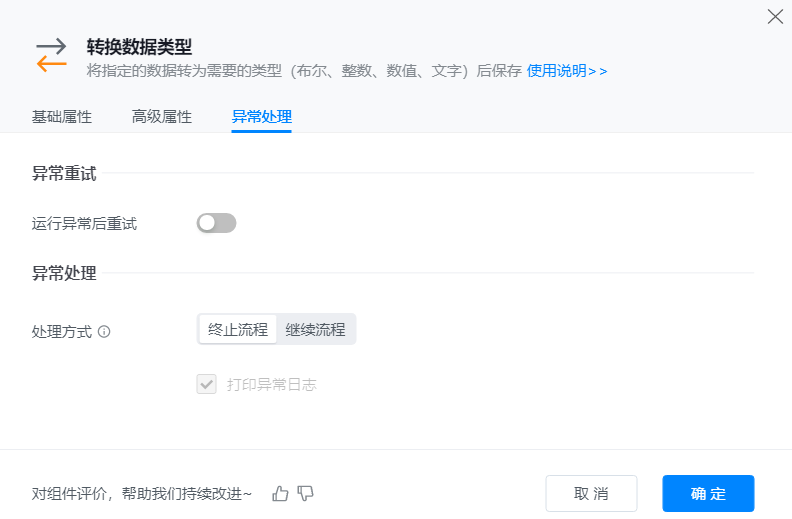 ● 异常重试:当流程运行过程中发生异常时,可根据实际需求配置是否启用重试逻辑。