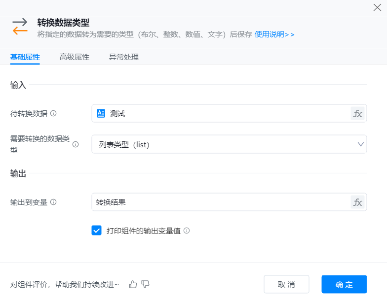 ● 需要转换的数据类型:下拉选择需要转换的数据类型,分别有:布尔类型(bool)、整数类型(int)、浮点类型(float)、文字类型(string)、列表类型(list)。