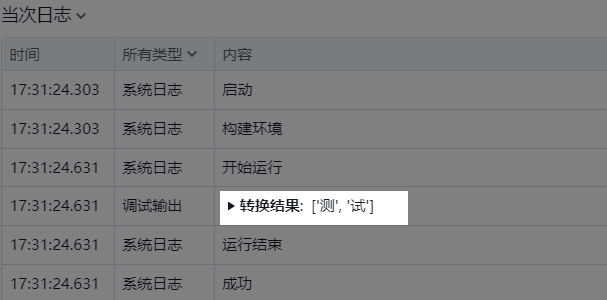 添加组件后,在属性栏中输入“待转换数据”,并选择对应的需要转换的数据类型,运行组件,输出并打印结果,以便查看转换后的数据。如:将“测试”转换为列表类型。