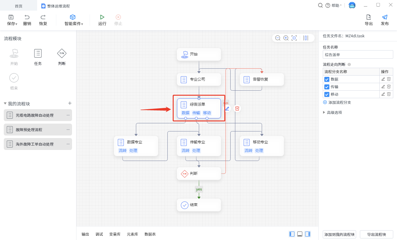 设计器支持多种类型的流程块,通过可视化拖拽的方式,实现流程图的设计。每个流程块可进行属性的设定,如设定输入输出,实现流程块之间的连接和数据流转。