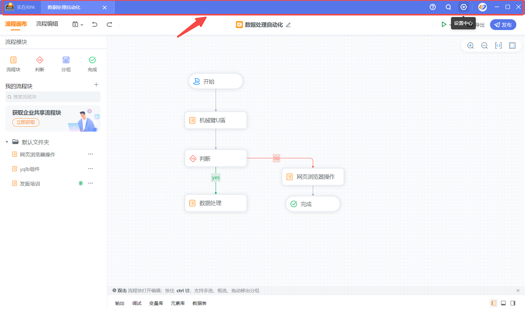 流程名称:显示当前编辑流程的名称(若是组件,则显示所属组件包名称)。在编辑状态下,可修改名称。