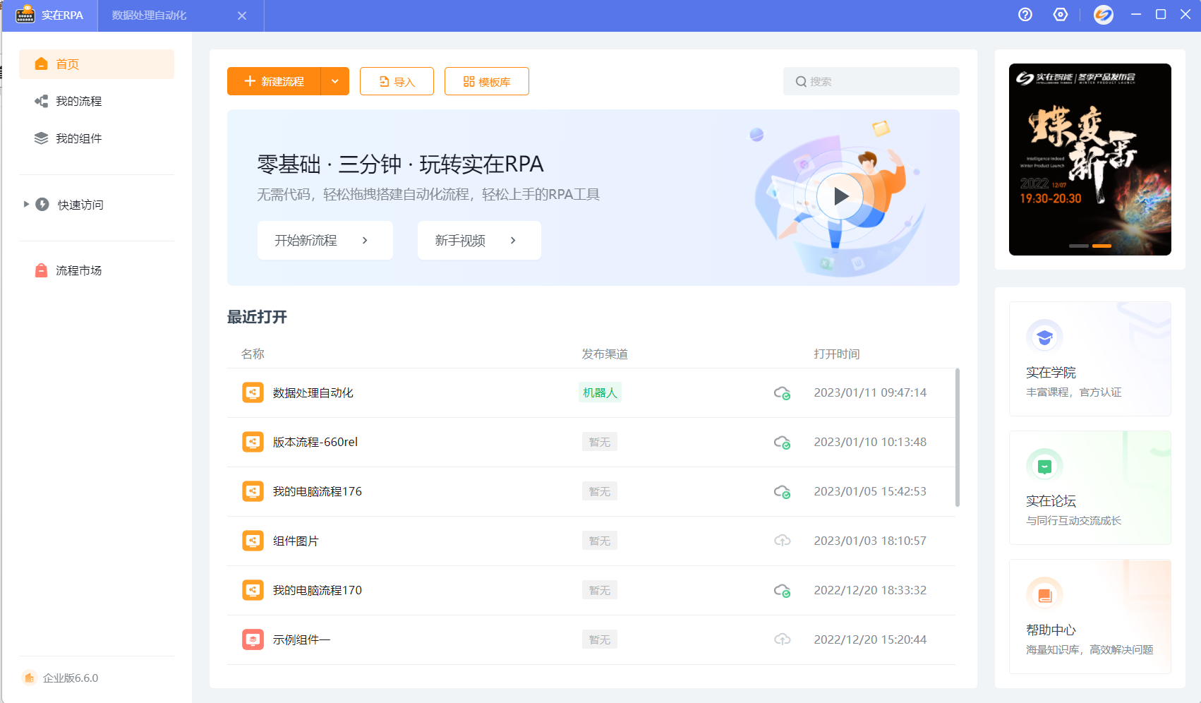 用户成功登录实在RPA设计器后,自动进入到设计器首页,首页是用户开启智能自动化的开始。