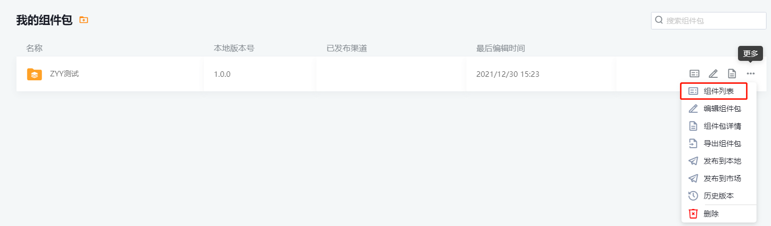 进入组件包内,或在【我的组件包】中的“组件列表”进行自建组件的管理。