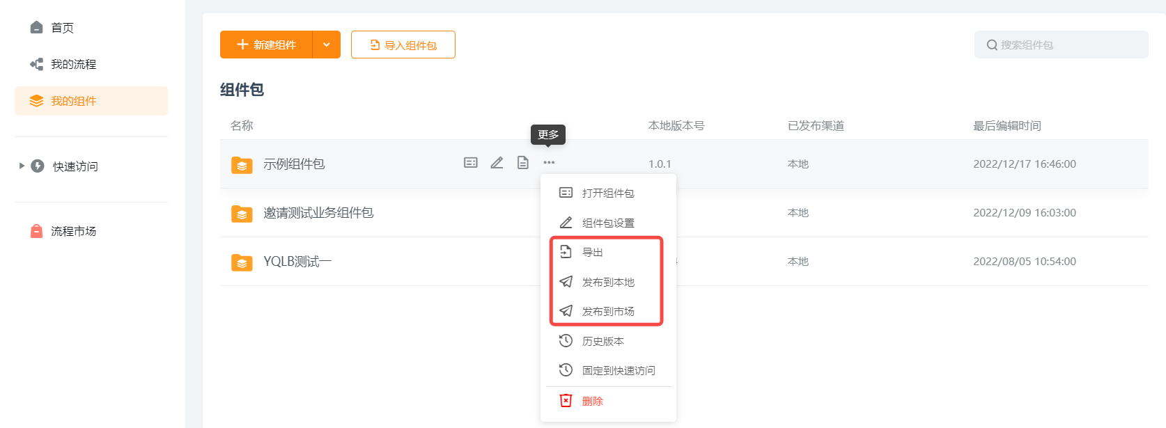 设计器主页的【我的组件】中,选中需导出的组件包,点击“更多” > “导出组件包”选项。如下图所示: