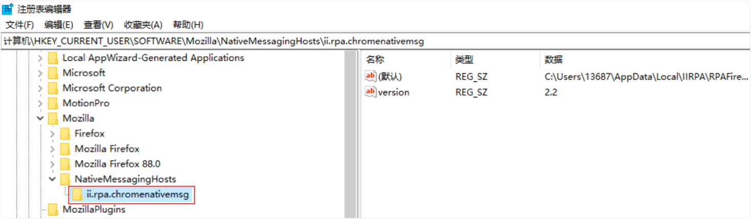 ② 找到路径 "计算机 \HKEY_CURRENT_USER\SOFTWARE\Mozilla\NativeMessagingHosts",选中 "NativeMessagingHosts" ,点击⿏标右键 => 新建 => 项 => 输⼊插件文件的 manifest.json的⽂件路径和插件版本号。