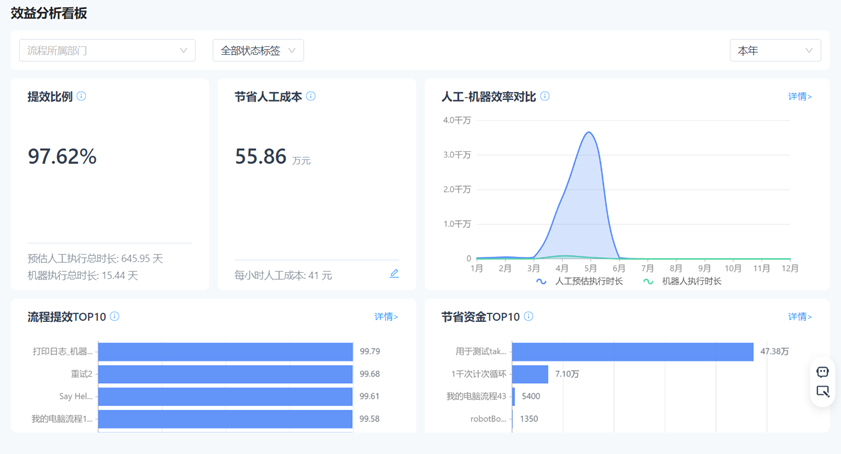 ● 节省资金TOP10:每个流程执行时,都有一个节省人工成本的计算,此处展示节省人工成本值最高的前10个流程。