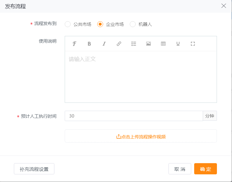 1、发布流程到公共市场需要完成实在智能的RPA开发者认证,拥有此认证的用户方可发布流程到公共市场。
