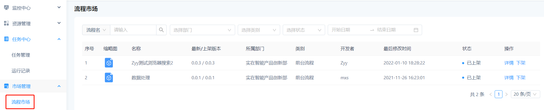 3、若开发者申请发布流程的数据无问题,审核通过并完成上架,此时即可在实在公共市场看到开发者上架的流程。开发者可以从市场下载该流程,其他用户也可通过公共市场下载并执行该流程。