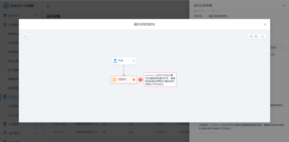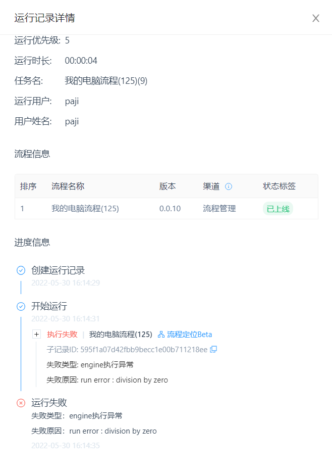运行记录详情可查看此次运行记录的基本信息、使用的流程信息、各节点详细的进度信息。同时,流程定位功能可帮助用户了解当前流程的运行状况(包括错误情况)。