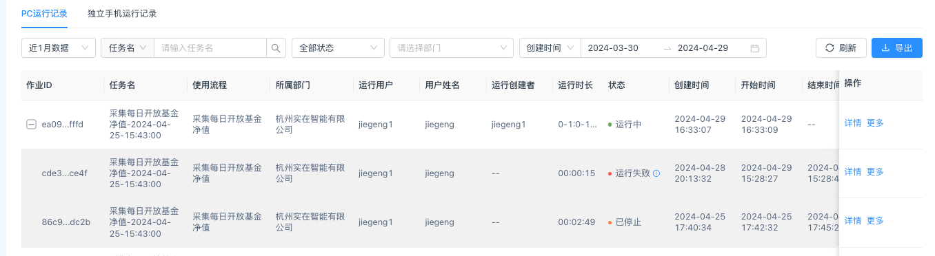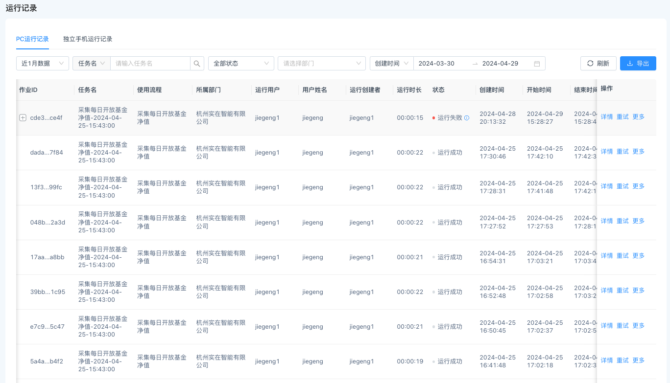 运行记录列表展示了所有流程运行生成的运行记录,默认查询近一个月数据,用户可切换查询所有数据,也可按任务名、作业ID、运行用户、状态、时间进行对应的记录搜索。支持查看运行记录的详情、日志、视频、参数、结果文件信息。支持对运行记录进行重试运行操作。