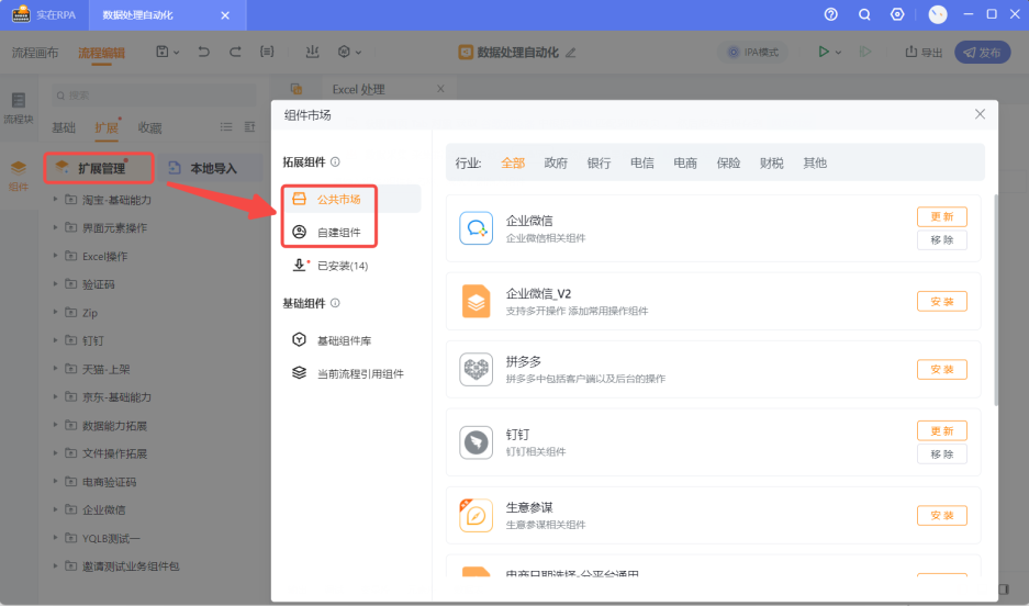 公共市场指实在智能官方提供给用户的的业务组件包,是在基础组件基础上的扩充。除了实在智能官方提供外,还有企业和个人开发者共享到公共市场的业务组件包。