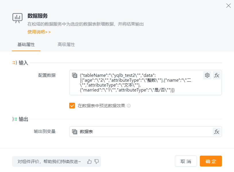 ● 在数据表中预览数据效果:若勾选此项,组件运行后的数据结果将在“数据表”tab中展示。注意:只展示最后一次运行的结果。