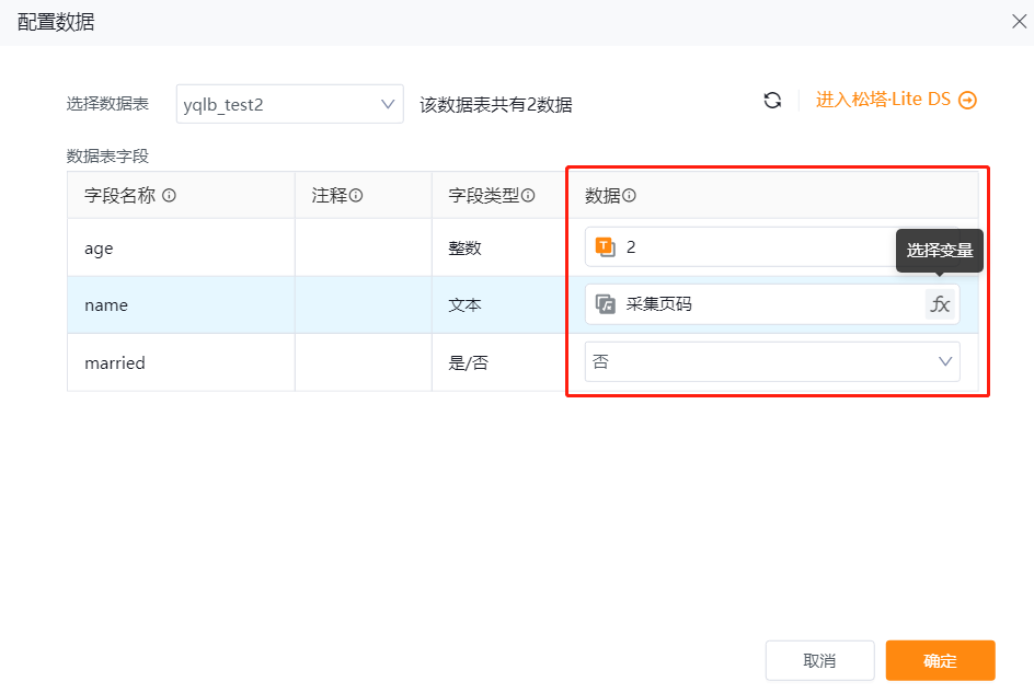 2、数据表字段:依据选择的数据表动态更新。您需在“数据”一列中选择/填写对应字段的值,支持变量和常量。
