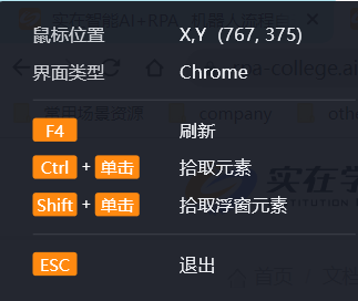 进入拾取模式,可鼠标随意移动识别元素,识别元素时尽量停留片刻,给程序一个反应的时间。进入拾取模式时,可以看到左上角或右下角显示的浮窗提示。