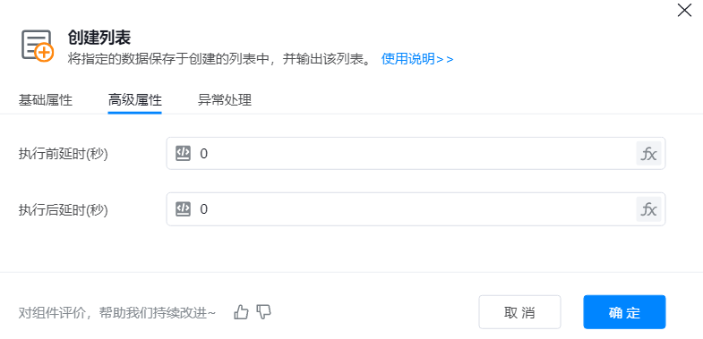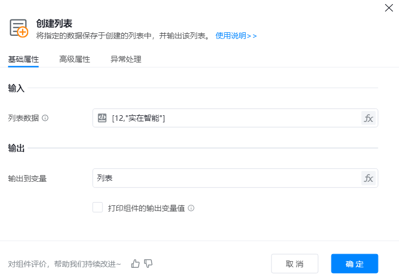 ● 列表数据:输入需创建的列表数据,或直接在变量库中选择已定义的变量。
