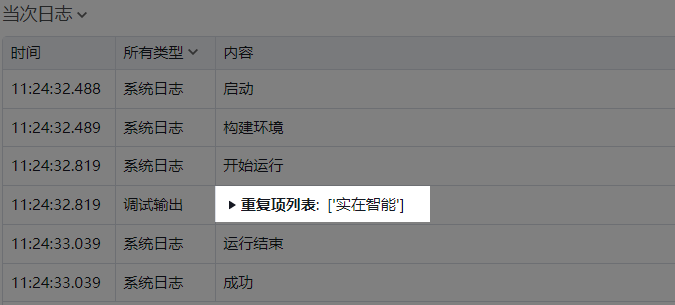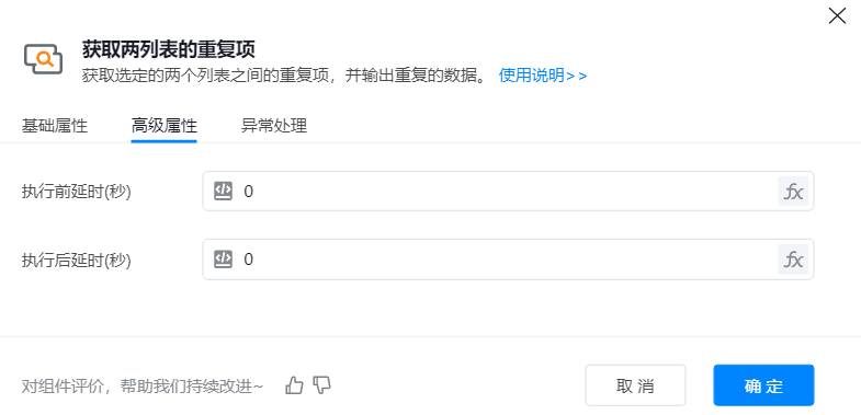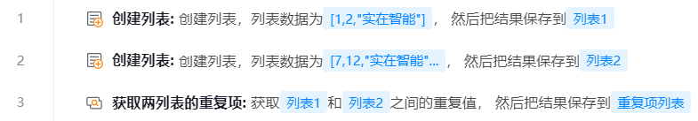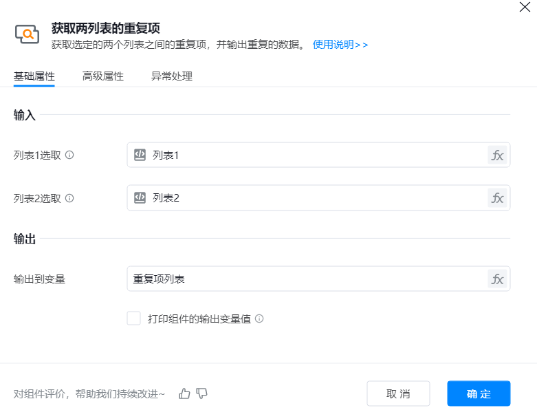 2. 添加【获取两列表的重复项】组件到可视化编辑区,在属性框中选择待操作的列表对象;运行组件,输出结果。