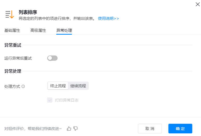 ● 异常重试:当流程运行过程中发生异常时,可根据实际需求配置是否启用重试逻辑。
