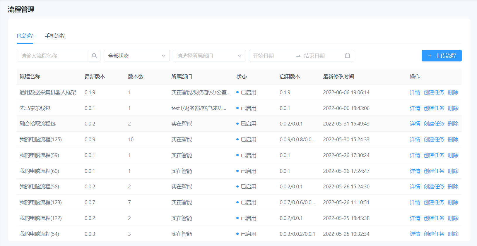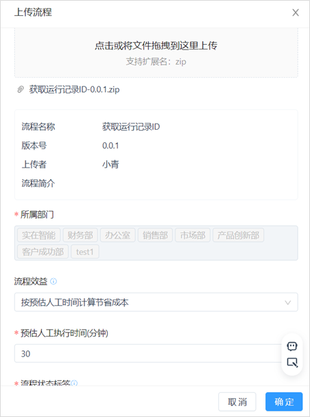 点击列表右上角的“上传流程”,上传流程包文件(zip格式),并选择需要使用该流程的部门。