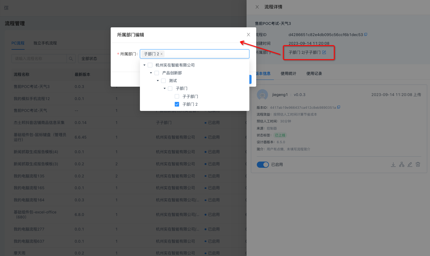 ● 修改所属部门:流程详情中可针对流程修改其所属部门,支持单选、多选,也可只选一个子部门。