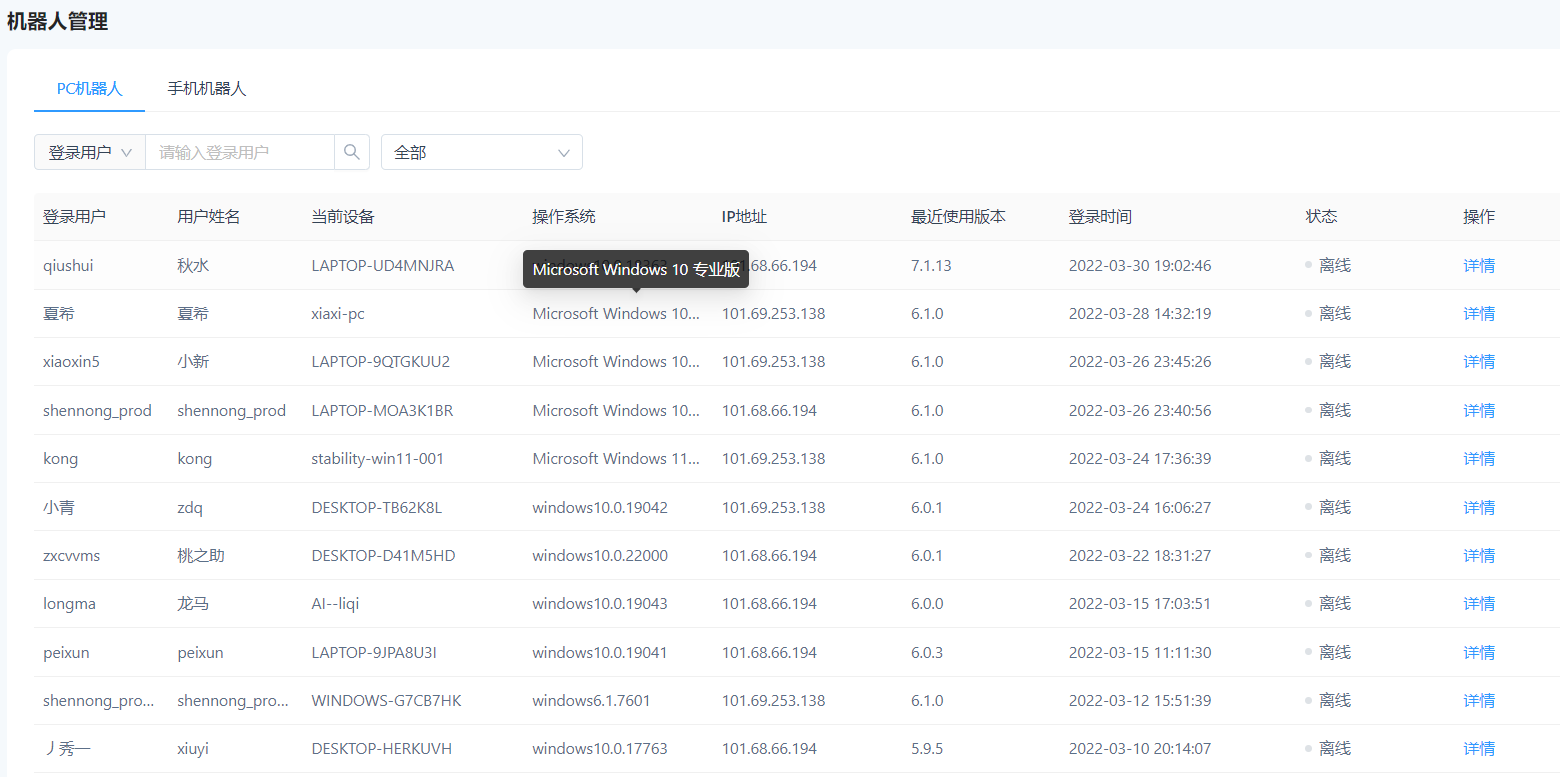 企业级RPA往往会连接多个实在RPA机器人,机器人管理可以让用户直观了解到各机器人资源的登录基本信息和状态信息等,并且支持通过搜索登录用户和过滤状态来快速定位。通过控制器分配的机器人账号,将会出现在机器人管理列表中。