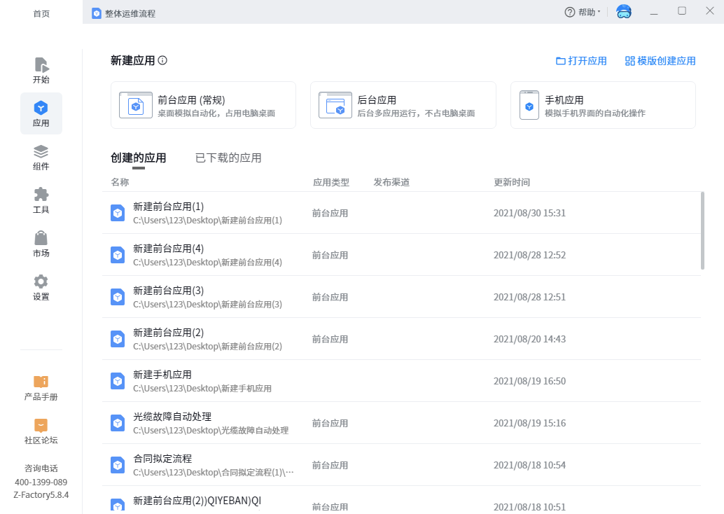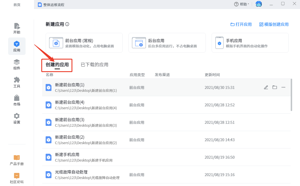Home page application includes two parts: application creation and historical application management, including: new foreground application, new background application, mobile phone application, local open application and template create application; History application management includes applications I created and downloaded. Different operations are described in detail below: