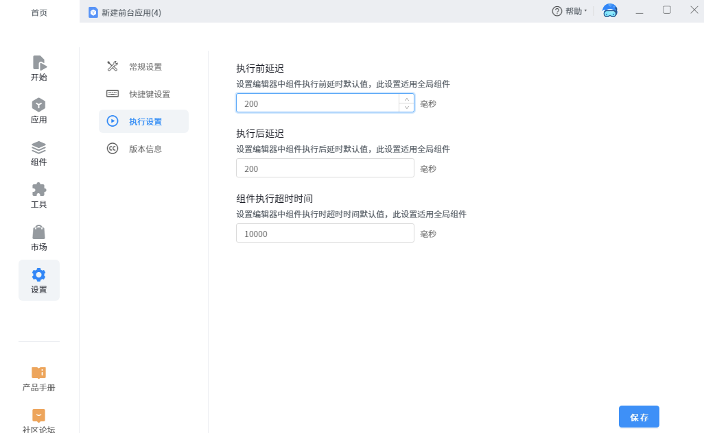 It is used to set the running item of process application, which affects the running time of application in factory editor debugging and BOT running. Each field can also be set separately in the options of each component. When the value set separately by the component conflicts with the value set globally by the home page, the value set separately by the component shall prevail. The set values include pre execution delay, post execution delay and component execution timeout.