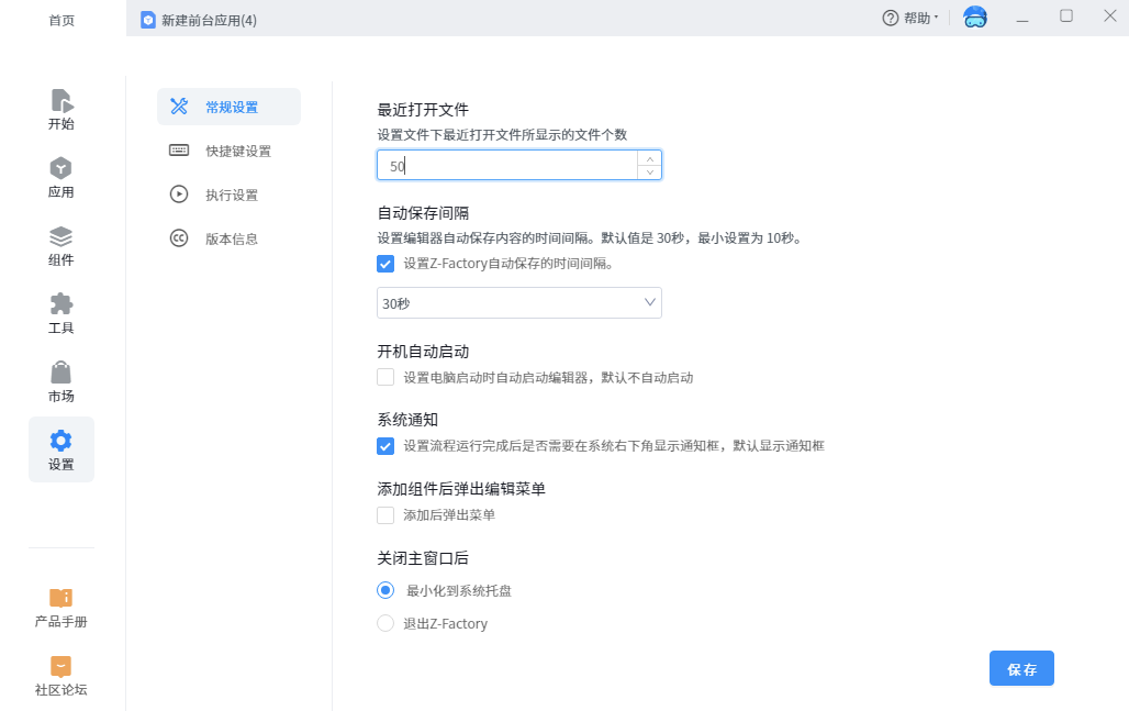 •Auto save interval, is the interval setting for automatically saving the editing process of the editor, that is, how often the system automatically saves when editing an application or component. The default is 30 seconds. You can select 20 seconds or 10 seconds.