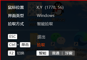 When entering the pick-up mode, you can move the mouse freely to identify elements. Try to stay for a while when identifying elements to give the program a reaction time. When entering the pick-up mode, you can see the floating window prompt displayed in the upper left corner or lower right corner, as shown in the figure;