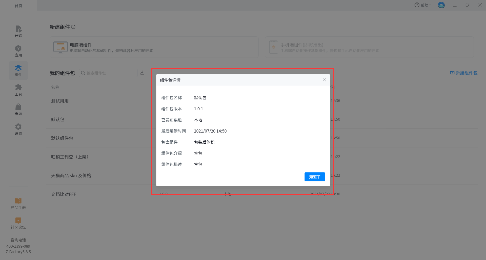 •Package details:View the basic information and contained component information of the current component package.