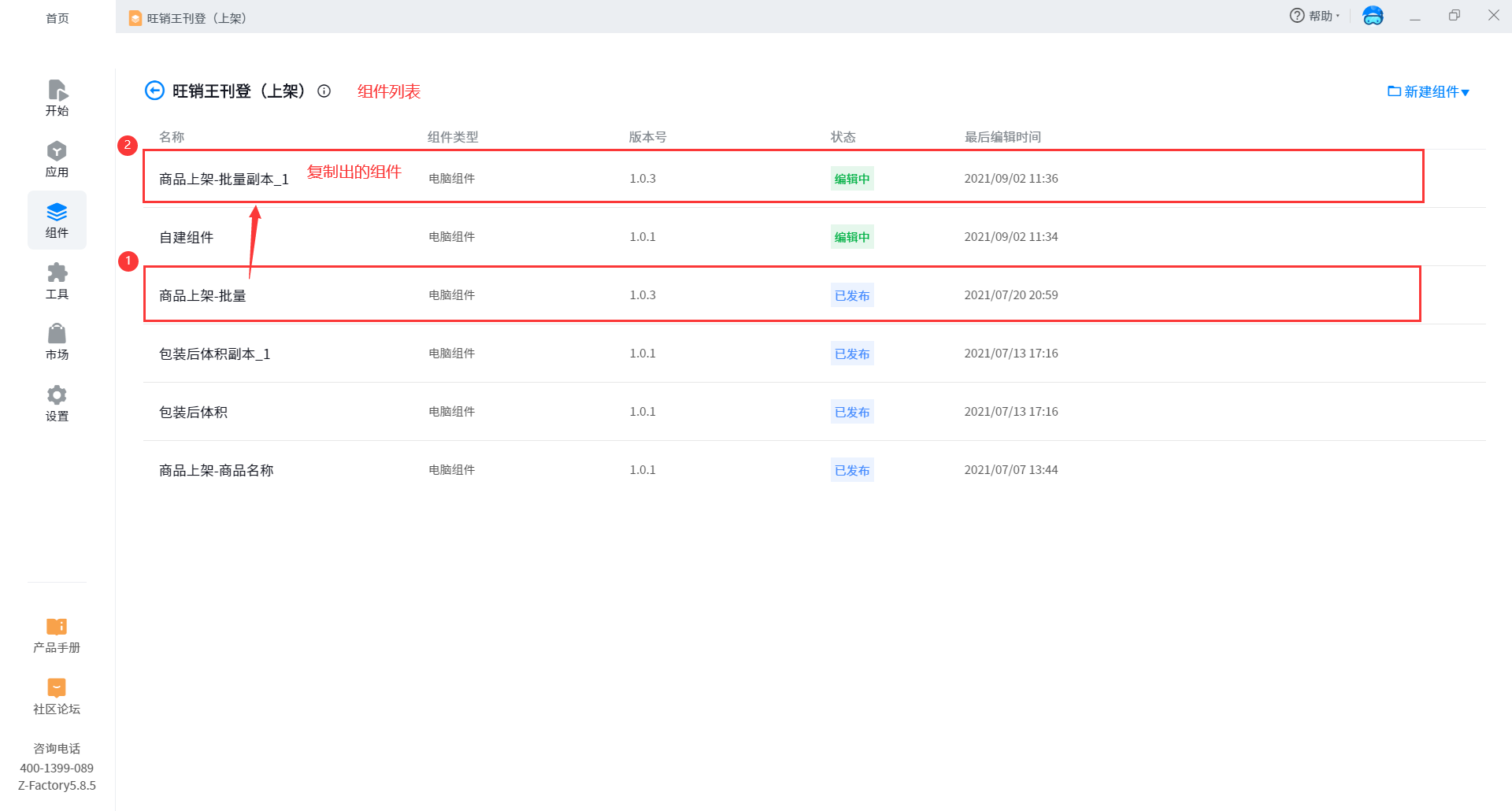 2. The current component status can be viewed in the component list. If the component package has been published, the component will inherit the status of the component package and become published. If it has not been published, it is being edited; Published components can also be edited again. When editing, the minimum version number will be automatically added to the component, and the status of the component will change to being edited.