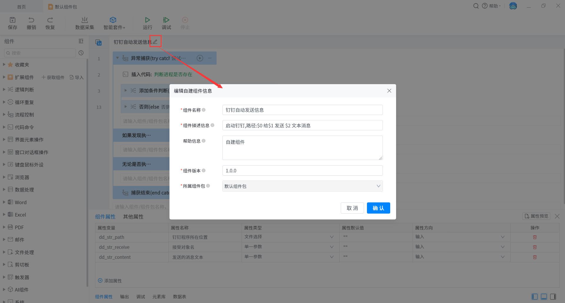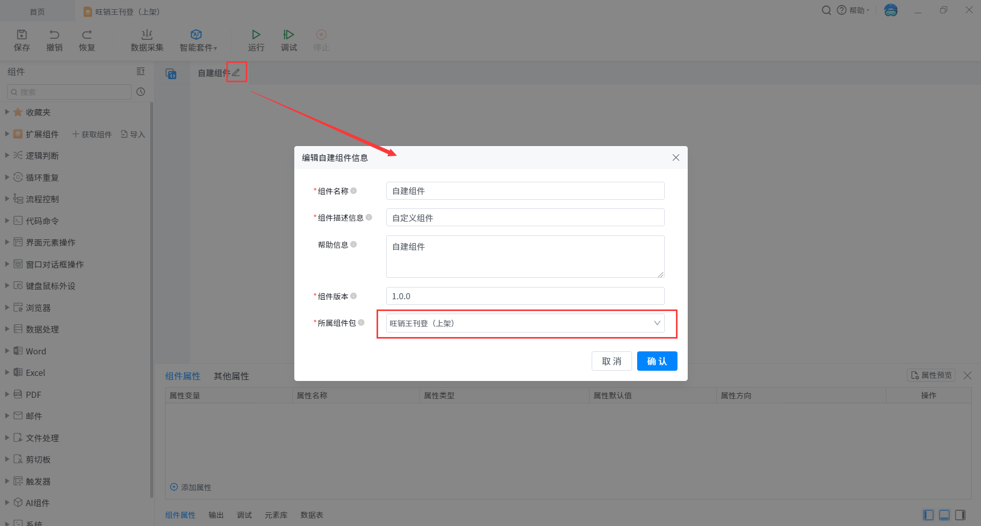 Create a self built component and edit the basic information of the component. The component package can be modified by clicking the drop-down button.