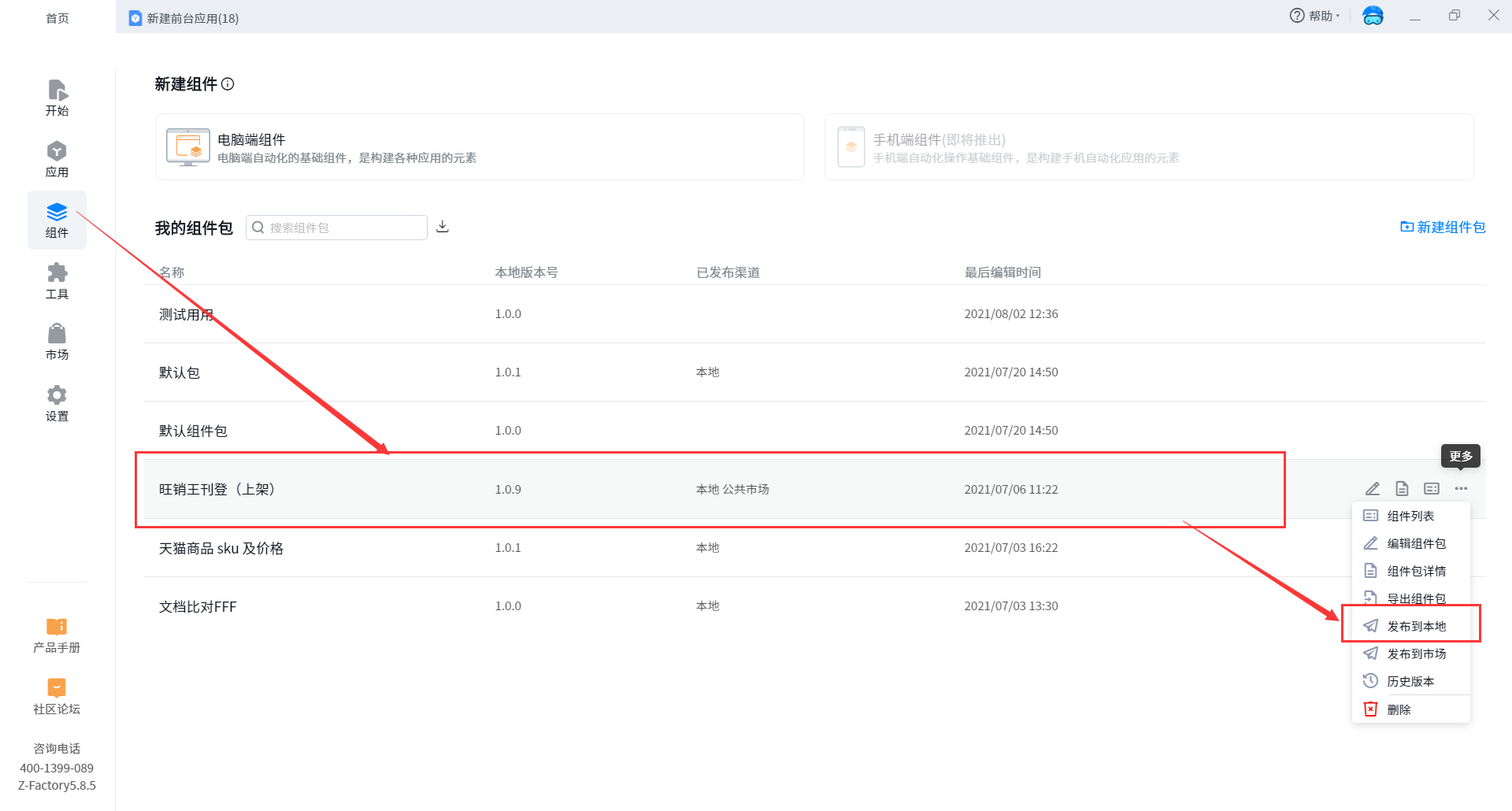 1. You can view more through the component package list under the home page - component page, and click publish to local for use. When publishing to local, the program will automatically add a minimum version number to the currently published component package to facilitate the version management of the component package.