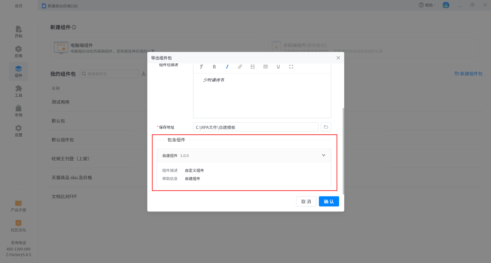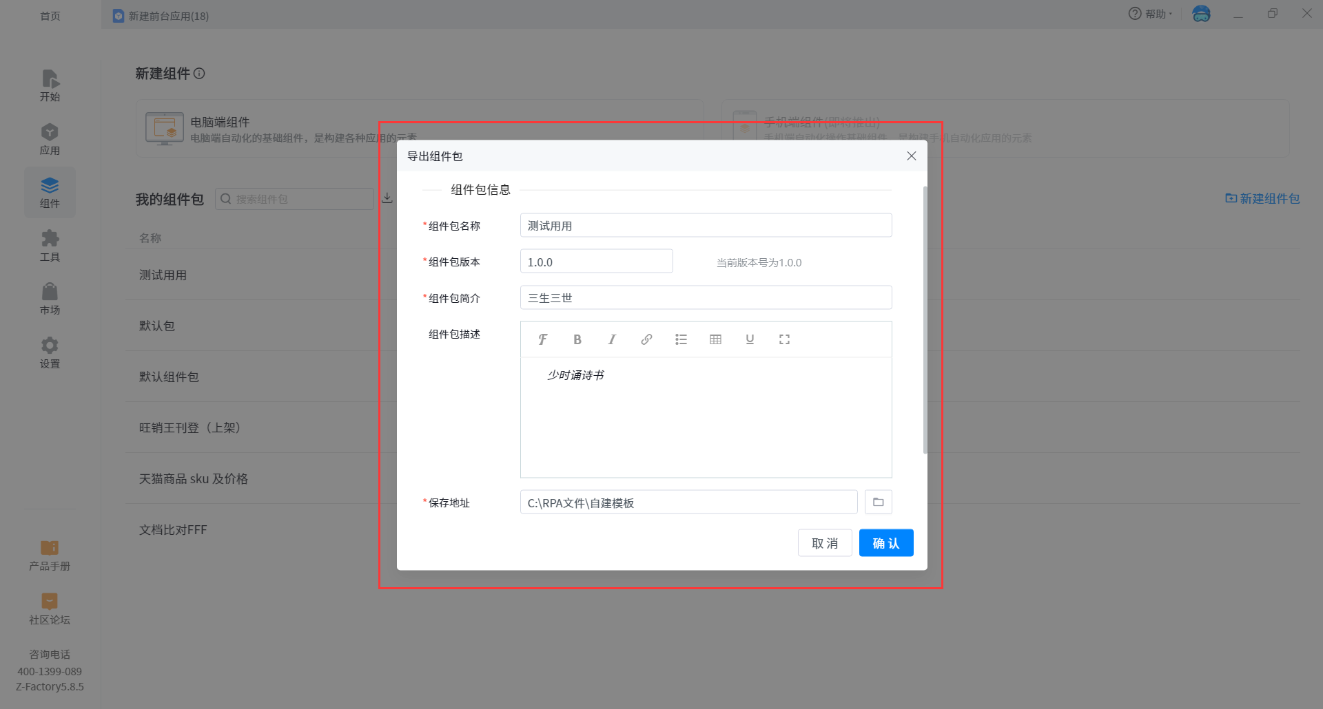 2. Click export component package to pop up the basic information box of export component package. In the information box, you can see the current component package name, version, brief introduction and contained components, so that you can confirm the information again.