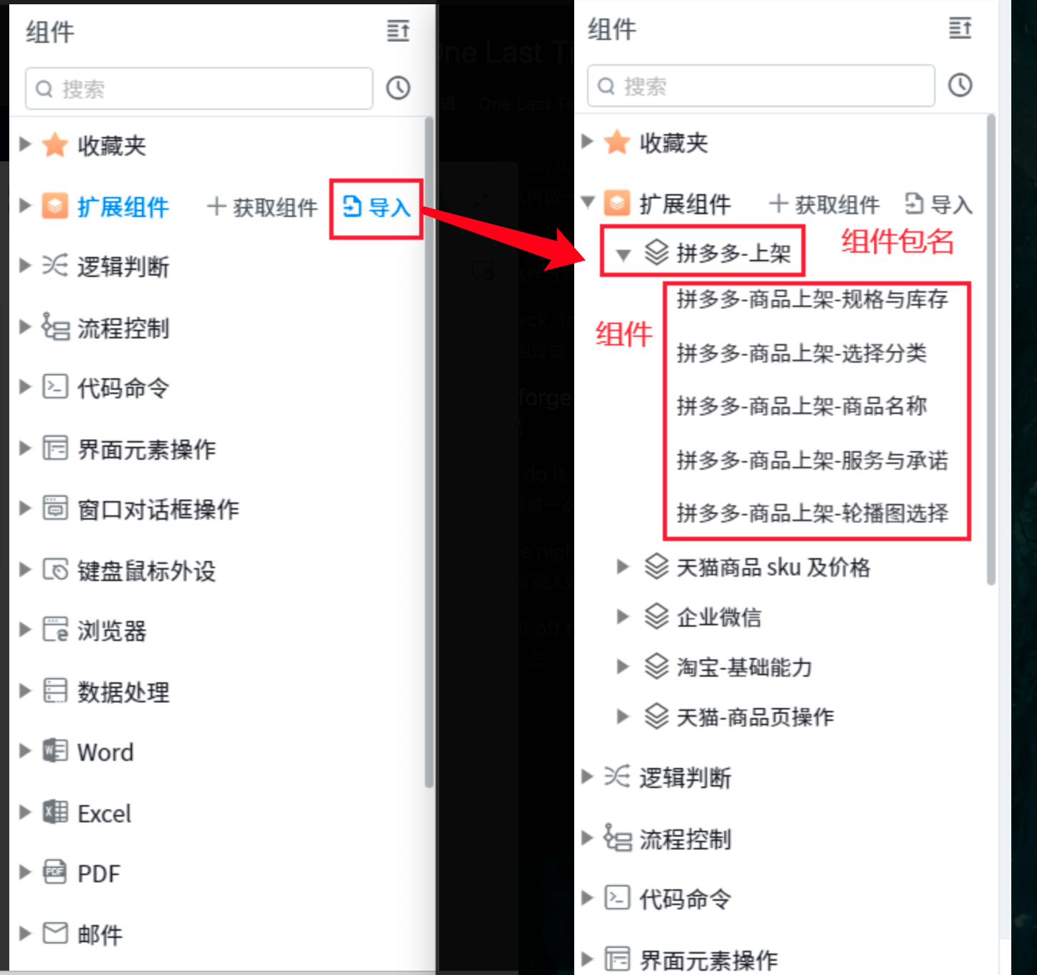 1. Enter the factory process application development page and click & ldquo; Import & rdquo; Button, you can select the currently obtained component zip package and import the component package into the local warehouse. At the same time, you can view the imported component package under the extended component menu, as shown in the following figure.
